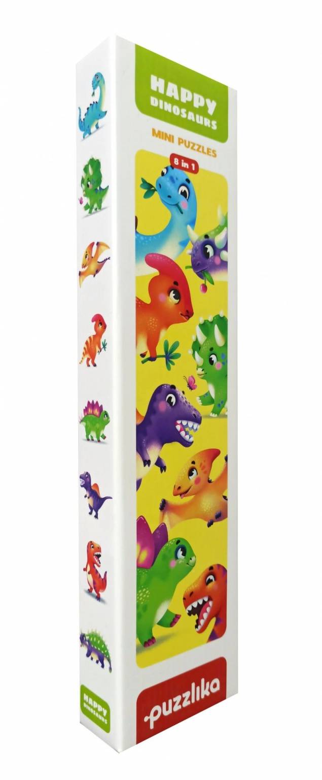 Dėlionė 8in1 „Laimingi dinozaurai“ susideda iš 16 dalių, surinktų į 8 paveikslus. Dėlionės, pagamintos iš storo kartono (3 mm storio), yra surenkamos į patogią dėžę kaip pieštuko dėklas, kurio vienos detalės dydis yra 4–6 cm, o vieno surinkto paveikslo dydis – 7–9 cm.