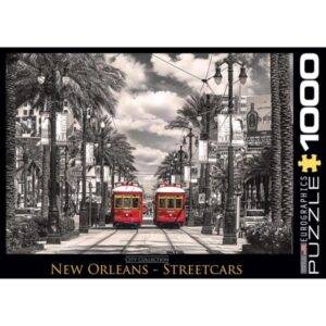 Nuostabi juodai/balta nuotrauka su ryškiomis spalvinėmis transporto detalėmis, kurią galėsite surinkti iš 1000 detalių.