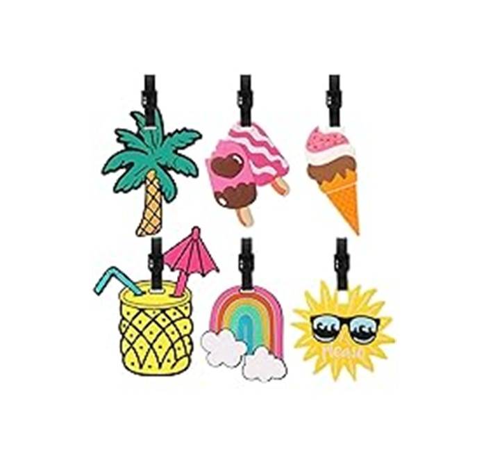 Kūrybiškos bagažo etiketės: Gausite 6 skirtingas bagažo etiketes. Mūsų kūrybingos bagažo etiketės yra įvairių unikalių ir smagių dizainų, pavyzdžiui, kokosų palmių, ledų, ledų ant pagaliuko, vaivorykštės ir kt. Jos ne tik palengvina jūsų bagažo paiešką bagažo karuselėje, bet ir suteikia jūsų kelionių aksesuarams individualumo.